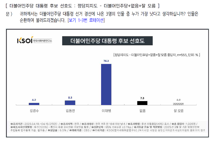 다만 지지하는 정당을 '민주당' 또는 '무당층(없음+잘 모름)'으로 응답한 이들로 분석해보면 이재명 예비후보가 76.2%로 압도적으로 나타났다. 김동연(8.3%), 김경수(4.2%) 순이었고, '없음'은 7.3%, '잘 모름'은 4.0%로 각각 집계됐다.