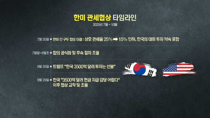 8일 통상당국 등에 따르면 한미는 지난 7월 미국으로 수입되는 한국산 제품 등에 대한 '상호관세율을 15%'로 잠정 합의했지만, 그후 70일이 지나도록 3500억달러에 달하는 대미(對美) 투자 패키지를 놓고 줄다리기를 이어가고 있다.