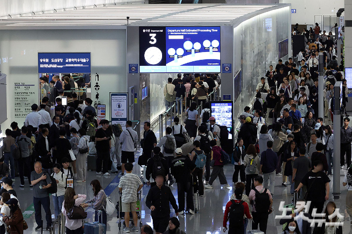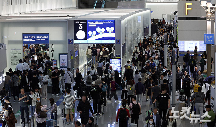 추석 연휴 첫 날인 3일 오전 인천국제공항 1터미널이 여행객들로 북적이고 있다. 인천국제공항공사는 이번 추석 연휴 기간(10월 2일 ~ 12일)에 245만 명이 인천공항을 이용할 것으로 전망했다. 일평균 이용객은 지난해 추석 연휴 대비 11.5% 증가한 22만 3천명 수준이다.