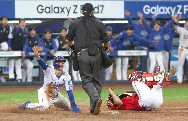 르윈 디아즈가 노경은의 슬라이더를 밀어 쳐 좌전 안타를 만들었고, 김성윤이 빠르게 달려 헤드 퍼스트 슬라이딩으로 득점했다. 접전 타이밍에서 김성윤이 몸을 틀어 SSG 포수 이지영의 태그를 피하면서 홈 플레이트를 찍었다. 비디오 판독 이후에도 판정은 바뀌지 않았다.