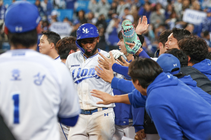 14일 대구 삼성 라이온즈 파크에서 열린 2025 KBO 프로야구 포스트 시즌 준플레이오프 4차전 SSG 랜더스와 삼성 라이온즈의 경기. 8회말 2사 1루 삼성 디아즈가 투런 홈런을 친 뒤 더그아웃에서 환영받고 있다. 연합뉴스 사자 군단의 가을 기세가 무섭다. 정규 리그 4위 삼성이 3위 SSG를 누르고 플레이오프(PO)에 진출했다.