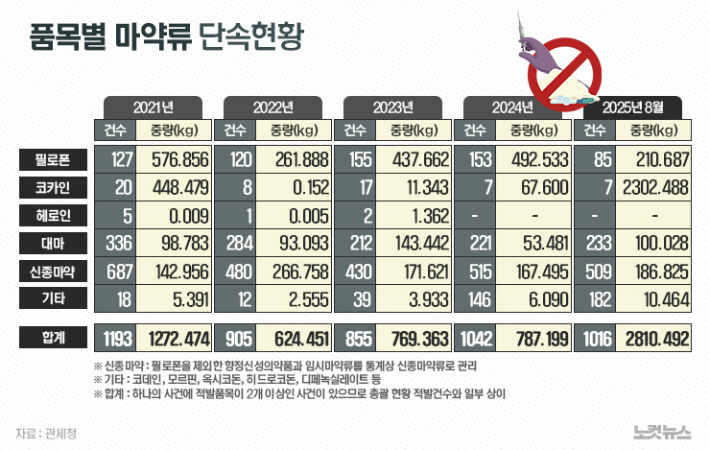 같은 기간 필로폰은 △2021년 127건 576.9kg △2022년 120건 261.9kg △2023년 155건 437.7kg △2024년 153건 492.5kg △2025년(8월) 85건 210.7kg으로 집계됐다. 대마는 △2021년 336건 98.8kg △2022년 284건 93.1kg △2023년 212건 143.4kg △2024년 221건 53.5kg △2025년(8월) 233건 100kg이다.