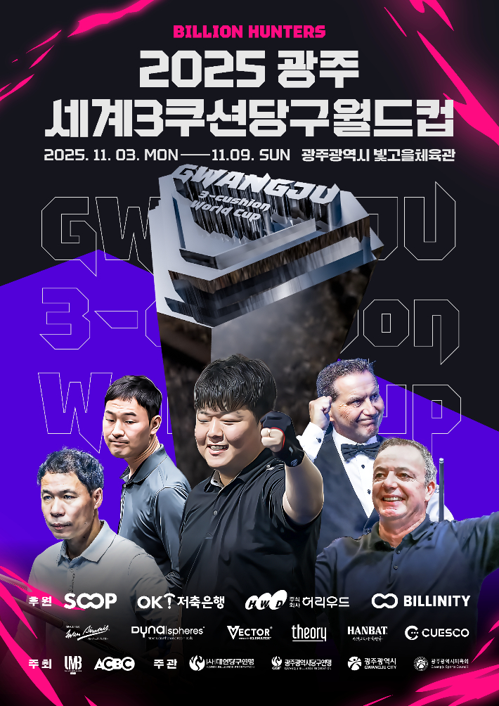 '2025 광주 세계3쿠션당구월드컵'이 오는 11월 2일 오후 2시 광주시 빛고을 체육관에서 열리는 개막식으로 열전에 돌입한다. 세계캐롬연맹(UMB)과 아시아캐롬당구연맹(ACBC)이 주최하고 대한당구연맹과 광주광역시당구연맹이 주관하는 대회다.