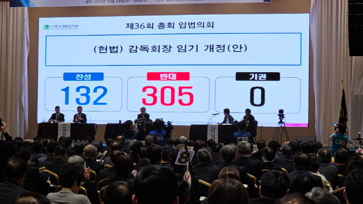교계 안팎으로 관심을 모았던 '감독회장 4년 겸임제'는 찬성 132표, 반대 305표라는 큰 표 차이로 부결됐습니다.