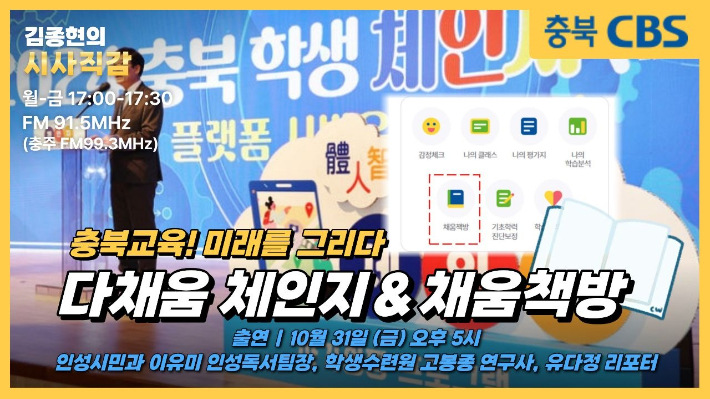 ◇ 김종현> <시사직감> 오늘은 <충북교육, 미래를 그리다> 코너로 진행됩니다. 교육은 흔히 백년대계로 일컬어지죠. <충북교육, 미래를 그리다>는 교육의 중요성을 다시 한 번 환기하면서 충북교육의 현 주소를 들여다보고 미래를 전망해 보는 시간입니다. 진행 방식은요, 저희 리포터가 이슈가 되는 교육 현장을 직접 찾아가서 취재한 내용도 전하고 정책 담당자들이 스튜디오에 직접 출연해서 상세한 설명과 함께 비전도 제시해 드립니다. 연말까지 모두 10차례 이어갈 <충북교육, 미래를 그리다> 일곱번째 시간인 오늘은 충북교육청이 자체 개발한 교수.학습 플랫폼이죠. 다채움의 '체인지'와 '채움책방'에 대해서 이야기 나눠보겠습니다. 충북교육청 인성교육팀 이유미 팀장, 학생수련원 고봉종 연구사, 그리고 유다정 리포터와 함께 하겠습니다. 오늘 방송은 유튜브 충북CBS를 통해서도 실시간 시청하실 수 있습니다. 스튜디오에 세 분 나오셨습니다. 안녕하십니까?