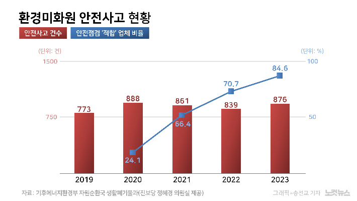 CBS노컷뉴스가 진보당 정혜경 의원실로부터 확보한 기후에너지환경부(환경부) 자료에 따르면, 환경미화원 안전사고 건수는 2019년 773건, 2020년 888건, 2021년 861건, 2022년 839건, 2023년 876건이었다. 2020년부터는 매년 800건 이상씩 꾸준히 사고가 나고 있다.