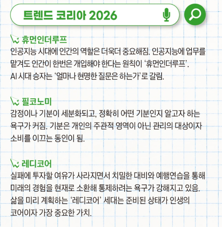 ◇ 김현정> 이 똑같은 이야기를 AI 전문가 김덕진 소장도 하시더라고요. 결국 자기가 좋아하는 일을 아주 잘하는 사람 그 사람이 살아남을 것 같아서 좋아하는 일을 해라라는 데 방점을 찍으시더라고요. 예 좋은 이야기였습니다. 내년도를 관통하는 트렌드 두 번째는 뭔가요? 키워드.