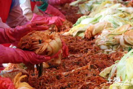 서강석(오른쪽 세 번째) 송파구청장이 6일 서울 송파구 한 어린이집 옆 주차장에서 열린 '송파구 사랑의 김장 나누기' 행사에서 자원봉사자들과 함께 김치를 담그고 있다. 총 3천Kg의 배추로 담근 김치 700상자(상자당 7Kg)는 경로당과 사회복지시설, 홀몸 어르신, 장애인, 한무보 가정 등 관내 취약계층에 전달될 예정이다.