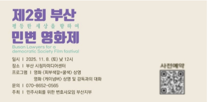 민주사회를 위한 변호사 모임(이하 민변) 부산지부가 오는 11월 8일 토요일 낮 12시, 부산 시청자 미디어 센터에서 '제2회 부산 민변 영화제'를 개최한다.