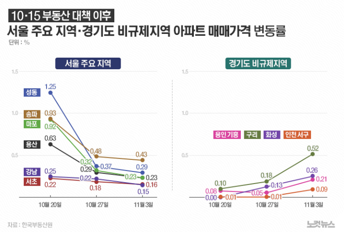 류영주 기자서울 전역과 경기도 일부 지역을 3중규제로 묶어버린 10.15 부동산 대책이 발표된 지 한 달이 되기도 전에 부동산 시장의 이상징후가 포착됐다. 경기도 비규제 지역을 중심으로 아파트 매매가격 상승 속도에 가속이 붙기 시작한 것이다.