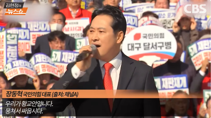 [장동혁> 우리가 황교안입니다. 뭉쳐서 싸웁시다. 이 모든 것이 이재명 한 사람 때문입니다. 이재명에 대한 재판이 다시 시작될 때까지 그리고 우리가 이재명을 탄핵하는 그날까지 여러분, 함께 뭉쳐서 싸웁시다]