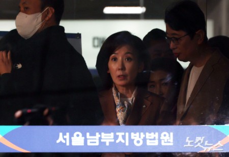 국민의힘 나경원 의원이 20일 오후 서울 양천구 남부지법에서 열린 '국회 패스트트랙(신속처리안건) 충돌 사건' 관련 1심 선고 공판에서 벌금 2,400만원을 선고 받은 후 법원을 나서고 있다.