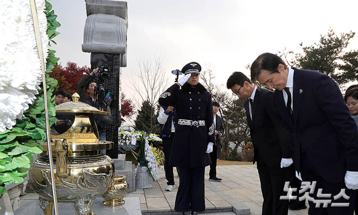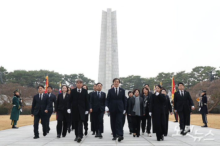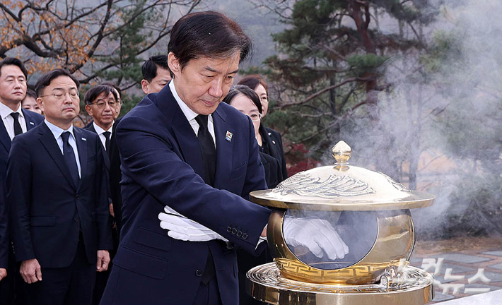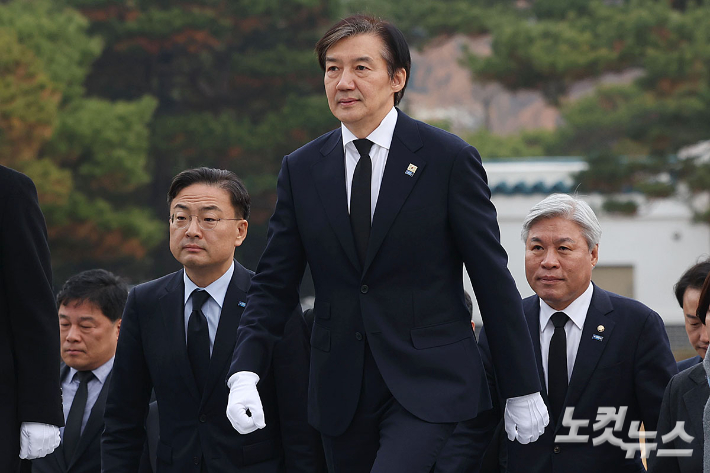 조국 조국혁신당 대표가 24일 오전 서울 동작구 국립서울현충원 현충탑과 김대중 전 대통령, 김영삼 전 대통령 묘소를 차례로 찾아 참배하고 있다.