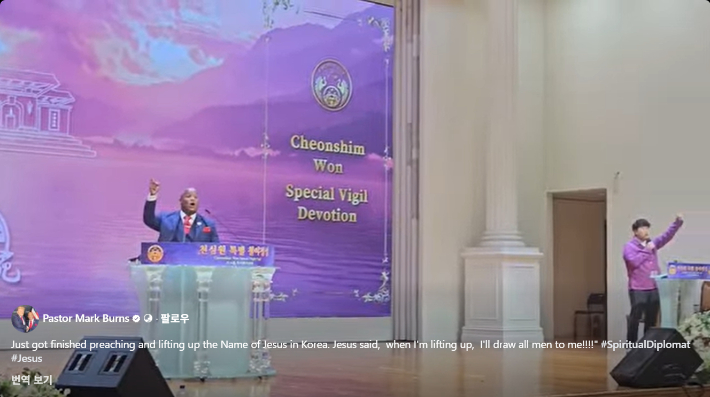 마크 번스 목사가 세계로교회 강단에서 설교를 전하고 있다. 마크 번스 목사 SNS 영상 갈무리그런데 이 마크 번스 목사가 통일교를 공개적으로 옹호한 인물이어서 교계 안팎에서 논란이 일고 있습니다.