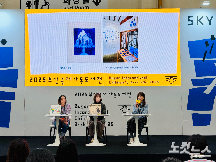 그림책 '미세미세한 맛 플라수프'의 김지형 작가와 '플라스틱 섬'의 이명애 작가는 11일 부산 벡스코에서 열린 2025 부산국제아동도서전 '우리의 내일을 고민하는 그림책' 대담에서 환경을 다룬 이유와 창작 과정에서 감당해야 할 책임을 이같이 털어놓았다.
