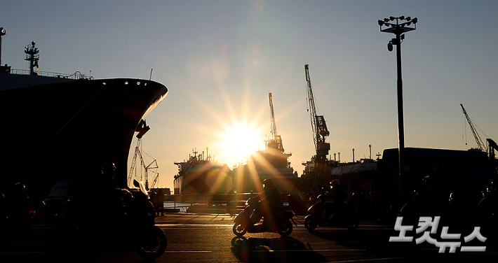 울산 HD현대중공업에서 건조 중인 수출용 선박 사이로 붉은 태양이 떠오르고 있다. 2026년 병오년(붉은 말의 해)에는 국내 조선업의 부활을 발판 삼아 우리나라 경제도 '붉은 말(적토마)'의 폭발적인 추진력으로 목표를 향해 멈추지 않는 한 해가 되기를 기대해 본다. 사진은 지난 5일 울산 HD현대중공업의 일출 모습.