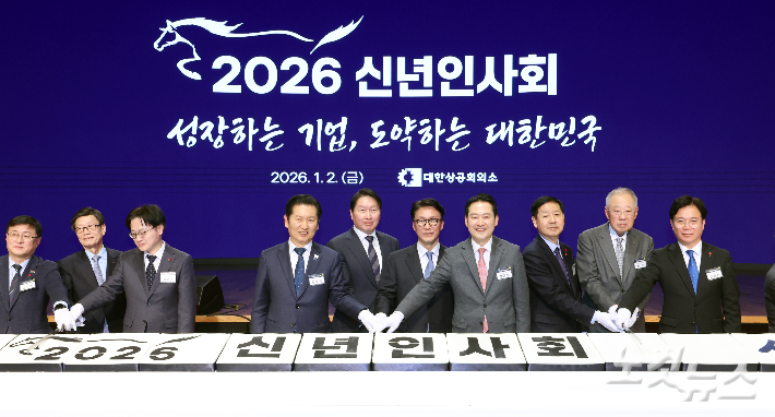 김민석(왼쪽 여섯 번째) 국무총리와 최태원(왼쪽 다섯 번째) 대한상공회의소 회장 등 참석자들이 2일 오후 서울 중구 대한상공회의소에서 열린 2026 경제계 신년인사회에서 떡케이크를 자르고 있다. 사진공동취재단