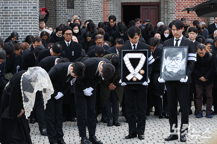 '국민배우' 안성기 영면, 슬픔에 잠긴 영화계 9일 오전 서울 중구 명동성당에서 고 안성기 배우의 장례 미사가 끝난 뒤 고인의 영정과 금관문화훈장을 든 배우 정우성, 이정재가 영결식장으로 향하고 있다. 지난 5일 74세를 일기로 세상을 떠난 고 안성기는 장지인 양평 별그리다에서 영원한 안식에 들어간다. 류영주 기자