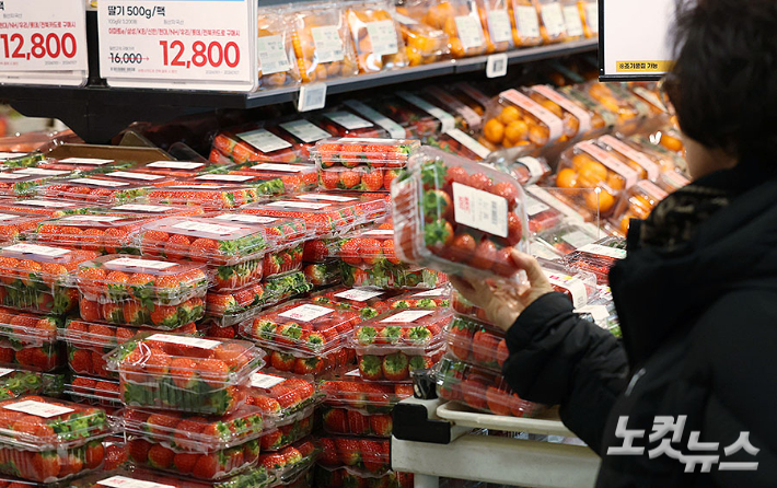 '귤도, 딸기도…' 겨울 제철 과일 가격 급등 딸기 가격이 연말·연초 수요 증가로 고공행진을 이어가고 있는 가운데 5일 서울 시내의 한 대형마트에 시민들이 딸기를 구매하고 있다. 지난 2일 기준 딸기 중도매인 가격(2㎏)은 4만5980원으로 집계됐다. 이는 전년 순 평균(3만3740원)보다 약 36%, 평년 순 평균(3만2558원) 대비로는 40% 이상 높은 수준이다. 류영주 기자