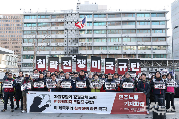 7일 오전 서울 종로구 주한미국대사관 앞에서 '자원강탈과 정권교체 노린 전쟁범죄자 트럼프 규탄! 미 제국주의 침략전쟁 중단 촉구 민주노총 기자회견이 진행되고 있다. 류영주 기자