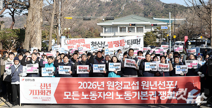 민주노총, 노란봉투법 시행령 폐기 촉구 "진짜 사장이 책임져야" 전국민주노동조합총연맹(민주노총) 조합원들이 7일 서울 종로구 청와대 앞에서 열린 '원청교섭 원년 선포! 모든 노동자의 노동기본권 쟁취' 2026년 민주노총 신년 기자회견에서 구호를 외치고 있다. 민주노총은 개정 노조법(노란봉투법) 시행령이 '이중' 교섭창구단일화 절차를 설정해 원청교섭을 가로막는다" 며 시행령 폐기 촉구 의견서를 청와대에 전달했다. 황진환 기자