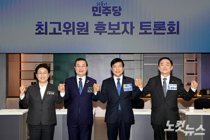 민주당 11일 보궐선거 앞두고 최고위원 후보자 토론회 더불어민주당 최고위원 보궐선거에 출마한 문정복(왼쪽부터), 이건태, 이성윤, 강득구 후보가 7일 오후 서울 마포구 상암동 JTBC에서 열린 최고위원 보궐선거 제3차 합동토론회에 앞서 기념촬영을 하고 있다. 민주당은 오는 11일 오후 최고위원 선출 결과를 발표한다. 이어 의원총회를 열고 새 원내대표를 선출한다. 국회사진기자단