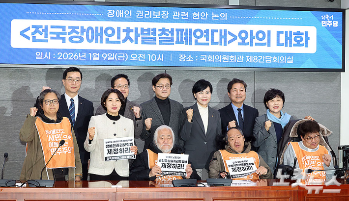 더불어민주당 전현희, 김영배, 서영교, 박주민, 홍익표 전 의원 등이 9일 국회 의원회관에서 열린 전국장애인차별철폐연대(전장연)와 장애인 권리보장 관련 현안 논의 간담회에 참석해 기념촬영 하고 있다. 앞서 전장연 박경석 공동대표는 지난 7일 서울 지하철 4호선 혜화역 승강장에서 기자회견을 열고 "김영배 의원의 제안을 수용해 지방선거까지 지하철 탑승 시위를 중단하고, 민주당 서울시장 예비 후보들과 간담회를 하겠다"고 밝힌 바 있다. 황진환 기자