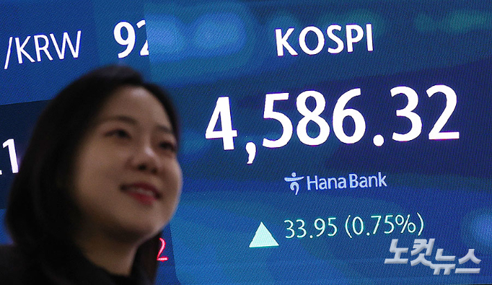 코스피 지수가 6거래일 연속 사상 최고치를 경신한 9일 오후 서울 중구 하나은행 딜링룸에 코스피 지수가 표시돼 있다. 이날 코스피는 전일 대비 33.95포인트(0.75%) 오른 4586.32에 마감하며 전날 세운 종가 최고치를 다시 넘어섰다. 류영주 기자
