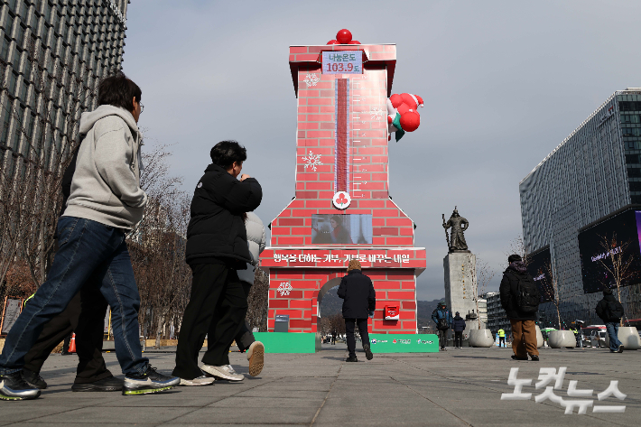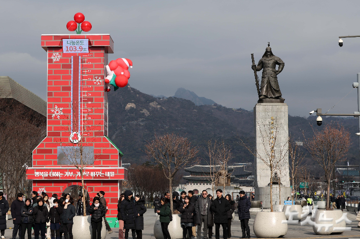 12일 서울 종로구 광화문 광장에 설치된 사랑의 온도탑에 나눔 온도가 103.9도를 나타내고 있다.