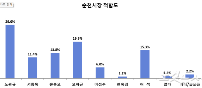 순천시장 적합도 조사에서는 노관규 29.0%, 오하근 19.9%, 허석 15.3%, 손훈모 13.8%, 서동욱 11.4%, 이성수 6.0%, 한숙경 1.1% 순으로 집계됐다.