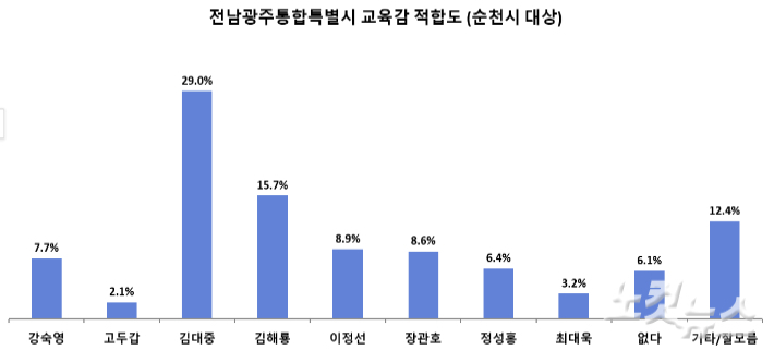 통합교육감 적합도에서는 김대중 29.0%로 선두를 기록했다. 이어 김해룡 15.7%, 이정선 8.9% 순으로 나타났다.