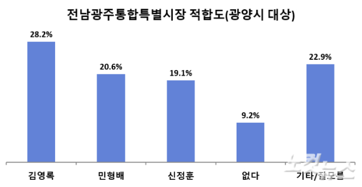 전남·광주 통합특별시장 적합도 조사에서는 김영록 28.2%, 민형배 20.6%, 신정훈 19.1%로 나타났다.