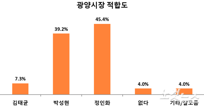 광양시장 적합도 조사에서는 정인화 45.4%, 박성현 39.2%, 김태균 7.3% 순으로 집계됐다.