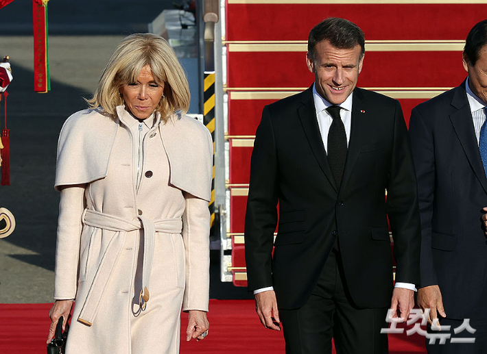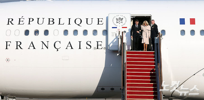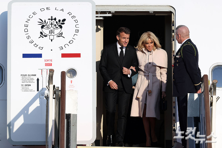에마뉘엘 마크롱 프랑스 대통령과 브리지트 마크롱 여사가 2일 경기 성남 서울공항에 도착하고 있다. 마크롱 대통령의 이번 방한은 2017년 취임 후 처음이며, 프랑스 대통령으로서는 11년 만에 이루어지는 국빈 방문이다. 이재명 대통령은 3일 마크롱 대통령과 정상회담과 국빈 오찬 등의 일정을 진행할 예정이다.