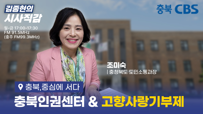 ◇ 김종현> <시사직감>은 매주 화요일 이 시간 <충북, 중심에 서다> 코너로 여러분 뵙고 있습니다. <충북, 중심에 서다>에서는 충청북도가 추진하는 다양한 정책과 안고 있는 현안을 각 실국의 책임자, 담당자들이 직접 출연해서 전해드리고 있는데요. 오늘은 조미숙 충청북도 도민소통과장과 충북인권센터 그리고 고향사랑 기부제에 대해서 이야기 나눴습니다.