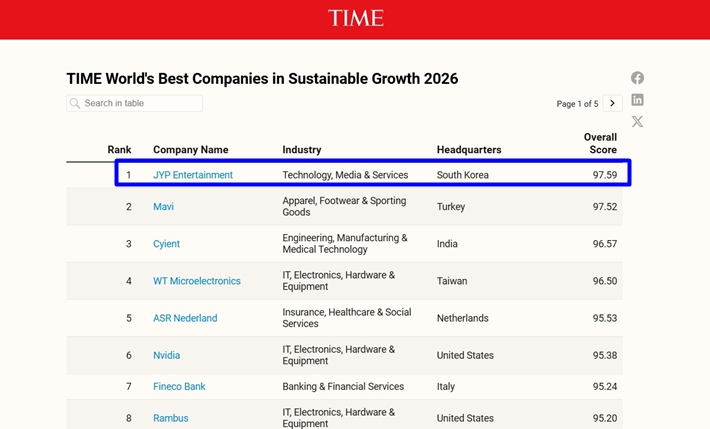 JYP, 美 타임지 선정 '2026 세계 최고 지속가능 성장기업' 1위 2025.11.14 12:09