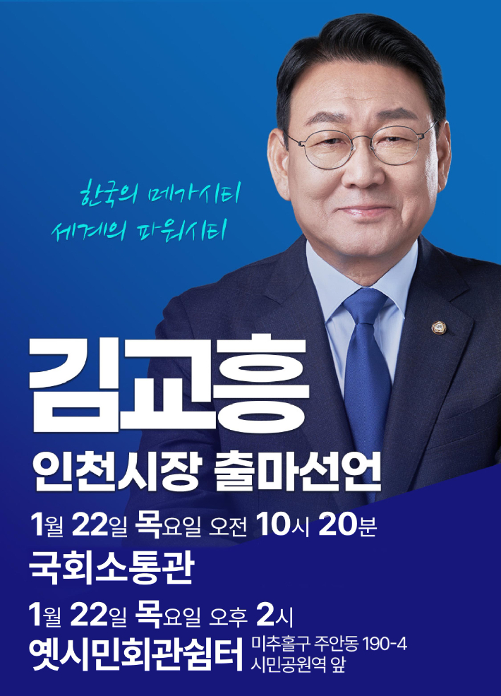 민주화 리더 김교흥, 22일 인천시장 출마선언…"파워시티로" 2026.01.20 23:39