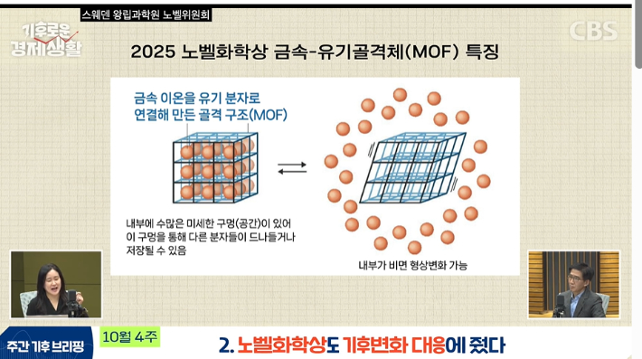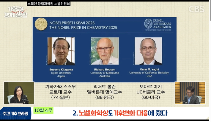 ◇ 최서윤> 노벨화학상 화두도 기후변화 대응…탄소 잡는 고체화합물 영예. 올해도 노벨상 수상자 발표가 완료됐죠. 이제 12월 시상식만 남겨두고 있는데요. 올해는 화학상에서 기후변화 대응 관련 연구 성과가 나와 소개해 드리려 합니다.
