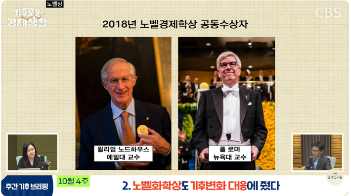 ◇ 최서윤> 네, 그렇습니다. 유엔 기후변화정부간협의체(IPCC)가 기후변화 문제의 심각성을 전 세계에 알린 공로로 노벨평화상을 수상했고요. 당시 앨 고어 전 미국 부통령도 다큐멘터리 '불편한 진실' 제작과 여러 강연 등을 통해 기후변화 대응에 앞장선 공로로 공동 수상을 한 적이 있습니다. 이렇게 관심이 크고 한동안 뜸하다가, 말씀하신 2018년에 노벨경제학상에서 윌리엄 노드하우스 미국 예일대 교수랑 폴 로머 뉴욕대 교수가 환경문제와 경제성장에 대한 거시적인 해결책을 제시한 공로로 수상의 영예를 안았어요. 특히 노드하우스 교수는 기후 경제학자이면서, 지구온난화를 막기 위해 탄소세를 도입해야 한다고 했는데, 이게 이듬해 유럽연합 탄소세 설계를 시작으로, 세계 여러 나라에서 정책으로 실현이 되고 있죠. 우리나라도 탄소세 얘기가 좀 나오고 있더라고요.