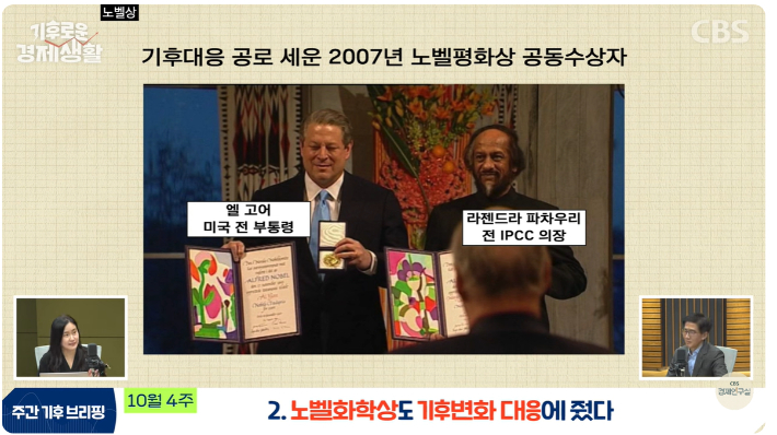 ◇ 최서윤> 저도 이렇게 시상을 해주게 되면, 앞으로 연구하는 각 분야, 물리학 등 여러 분야 있는데 기후변화 문제를 해결하기 위한, 각자 맡은 자기 전문분야에서 기후변화 문제를 해결할 해법들을 찾을 수 있게 되지 않을까, 하는 기대가 들었습니다. 제가 궁금해서 좀 찾아봤어요. 지금까지 노벨상 수상자 발표에서 기후변화 관련해서 언제부터, 누구 누구, 수상했는지 찾아봤는데요. 일단 노벨상 수상자 발표에서 기후변화 관련 연구 업적이 크게 주목받은 계기는 2007년이에요. 노벨평화상 받았죠.