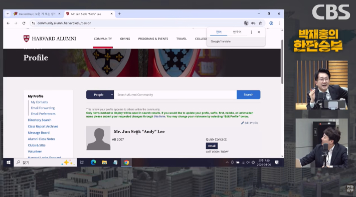◇ 박재홍> 박재홍의 한판승부, 개혁신당 이준석 당 대표와 함께 유튜브 연장 방송 이어가고 있습니다. 오늘 특별히 연장방송하는 이유는 전한길 씨가 이준석 대표에 대해, 하버드 학력 위조설에 대해 계속 주장을 하고 있기 때문에 그 부분에 대해서 실시간으로 한번 하버드 동문 사이트에 들어가서, 또 하버드 졸업을 인증하는 부분을 저희가 한번 보여드리고자 기획을 했습니다.