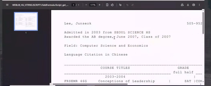 ◆ 이준석> 이건 제가 학비 안 낸 게 있으면 나오는 거고요. 제가 띄워드릴 테니까 우선 잠깐 이거 껐다가, 잠깐 화면 내렸다가 제가 PDF를 띄운 다음에 제가 갈게요. 여기 왼쪽에 보시면 2003년에 서울과학고등학교에서 어드밋(Admitted) '입학되었다' 그리고 에이비 (AB Degree)를 2007년 6월에 받았다.
