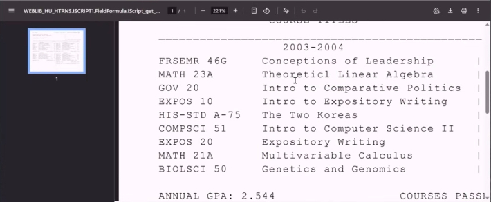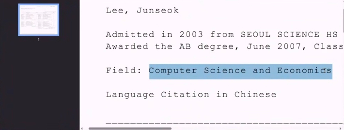 필드(Field)는 '컴퓨터 사이언스 앤 이코노믹스' 그리고 랭귀지 사이테이션(Language Citation)은 인 차인니스(in Chinese) 수업에서 어학 우수자가 됐다. 보시면은 캠브리지 매사추세츠(Cambridge, Massachusetts), 퀸시 하우스(Quincy House) 이게 기숙사 이름이고 이런 거예요. 그런데 이거를 가지고 다 보여줘도 이제 난리인 거죠.
